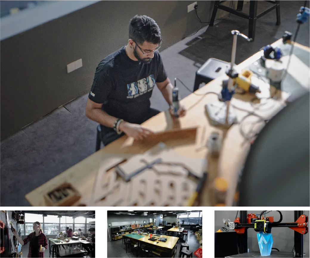 The Fabrication Lab is an industry-standard space equipped with tools such as 3D printers and laser cutters to help students merge their creative ideas with the latest technology, ensuring a practical hands-on experience and amazing outcome.